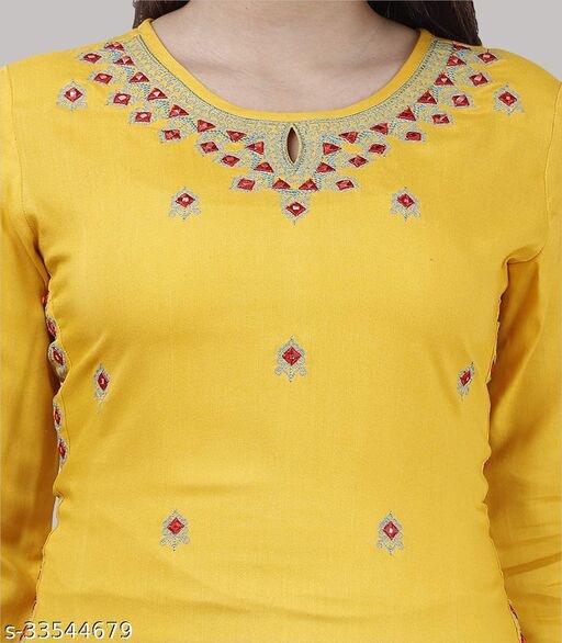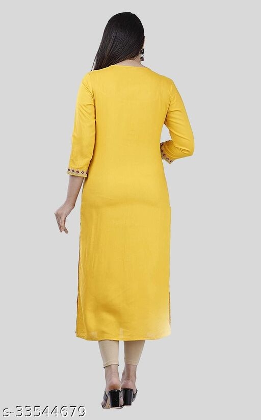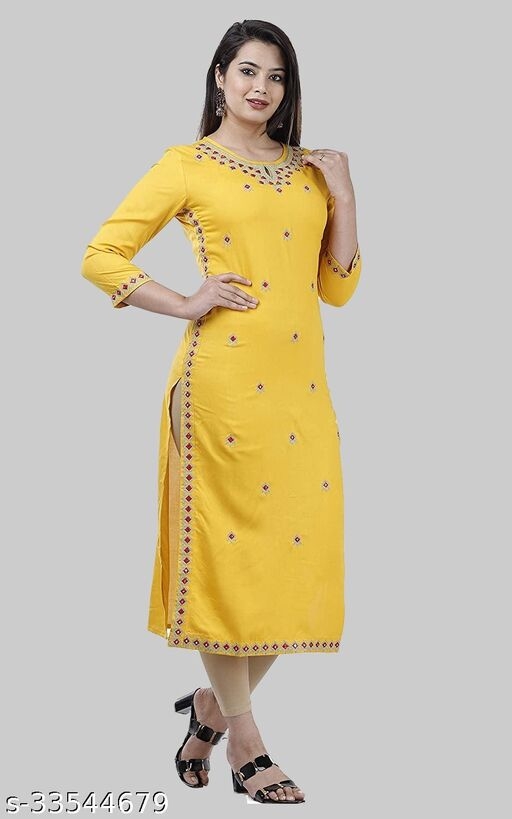 Fabric: Rayon Sleeve Length: Three-Quarter Sleeves Pattern: Embroidered Combo of: Single Sizes: XL (Bust Size: 42 in, Size Length: 46 in) L (Bust Size: 40 in, Size Length: 46 in) M (Bust Size: 38 in, Size Length: 46 in) XXL (Bust Size: 44 in, Size Length: 46 in) IT IS ALTERNATE YELLOW COLOUR EMBROIDERY KURTI Country of Origin: India