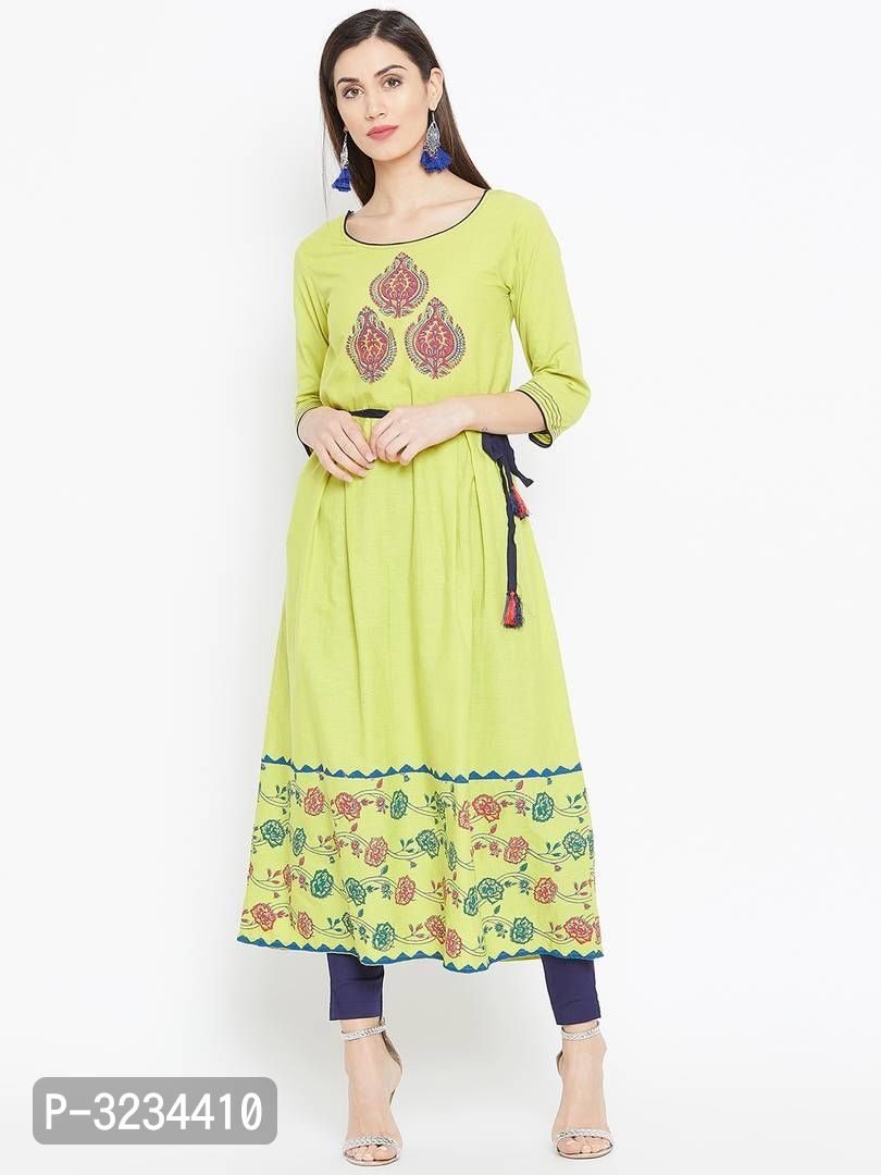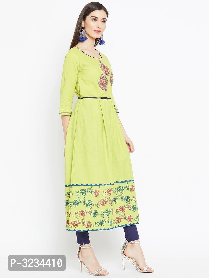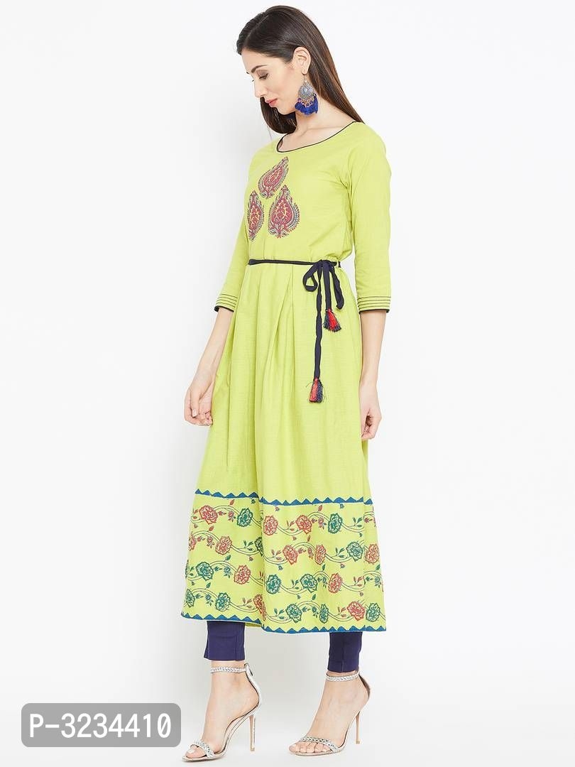 Color: Green Fabric: Cotton Type: Stitched Style: Printed Design Type: A-Line •Fabric: Cotton •Sleeves: Three-Quarter Sleeves •Sleeve Type: Regular •Length: Up To 47 in•Length Type:Calf Length •Neck Type: Round •Contain: It Has 1 Piece Of Women's Kurti •Work: Block Printed •Occassion: Party