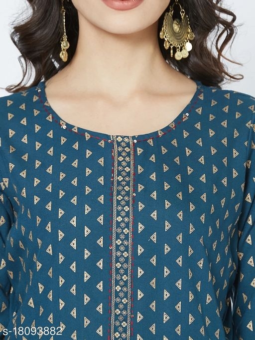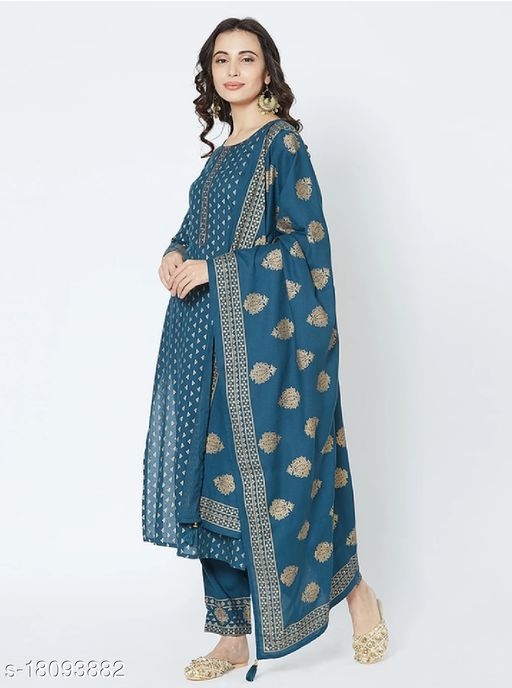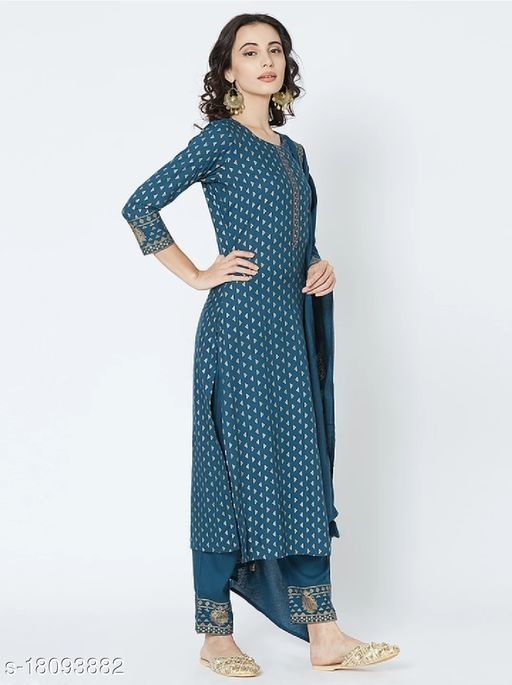 Kurta Fabric: Rayon Bottomwear Fabric: Rayon Fabric: Rayon Sleeve Length: Three-Quarter Sleeves Set Type: Kurta With Dupatta And Bottomwear Bottom Type: Pants Pattern: Printed Multipack: Single Sizes: XL (Bust Size: 34 in, Kurta Hip Size: 34 in, Kurta Length Size: 42 in, Bottom Waist Size: 34 in, Bottom Hip Size: 34 in, Bottom Length Size: 38 in, Duppatta Length Size: 2.5 m) L (Bust Size: 32 in, Kurta Hip Size: 32 in, Kurta Length Size: 42 in, Bottom Waist Size: 32 in, Bottom Hip Size: 32 in, Bottom Length Size: 38 in, Duppatta Length Size: 2.5 m) M (Bust Size: 30 in, Kurta Hip Size: 30 in, Kurta Length Size: 42 in, Bottom Waist Size: 30 in, Bottom Hip Size: 30 in, Bottom Length Size: 38 in, Duppatta Length Size: 2.5 m) XXL (Bust Size: 36 in, Kurta Hip Size: 36 in, Kurta Length Size: 42 in, Bottom Waist Size: 36 in, Bottom Hip Size: 36 in, Bottom Length Size: 38 in, Duppatta Length Size: 2.5 m) Country of Origin: India