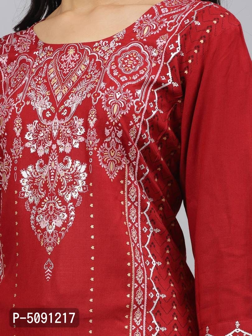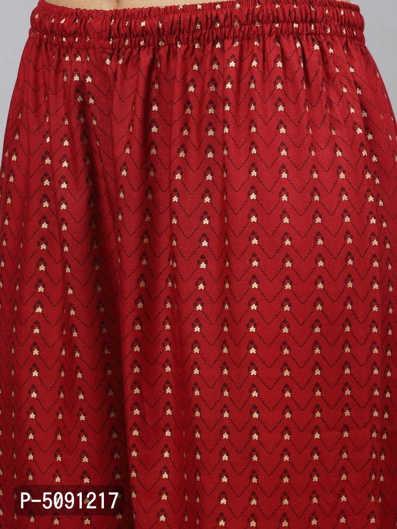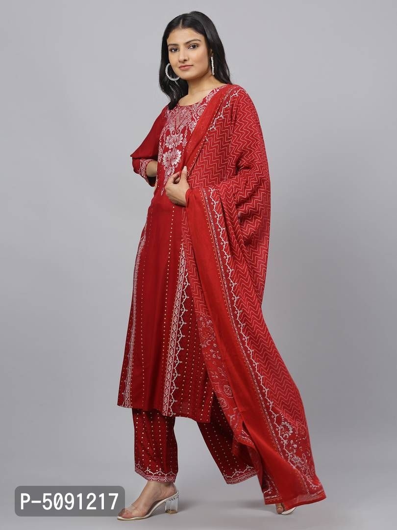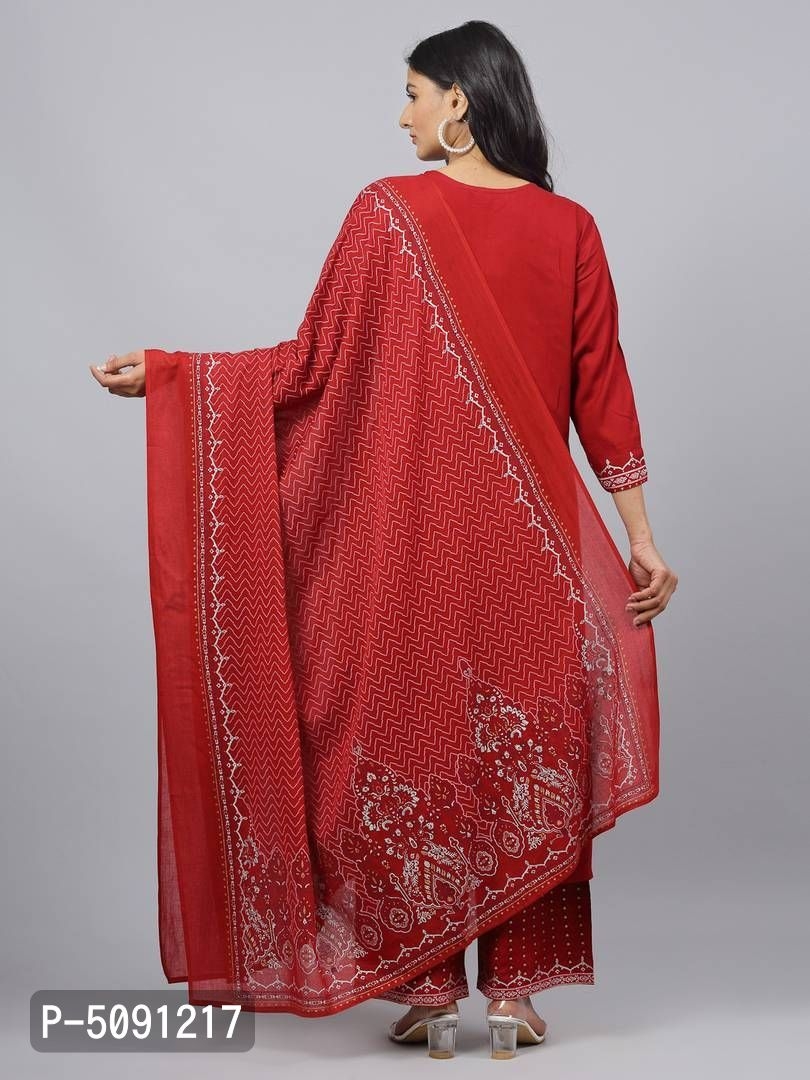 Color: Red Fabric: Rayon Type: Kurta, Bottom and Dupatta Set Style: Printed Design Type: Straight Kurta With Palazzo and Dupatta